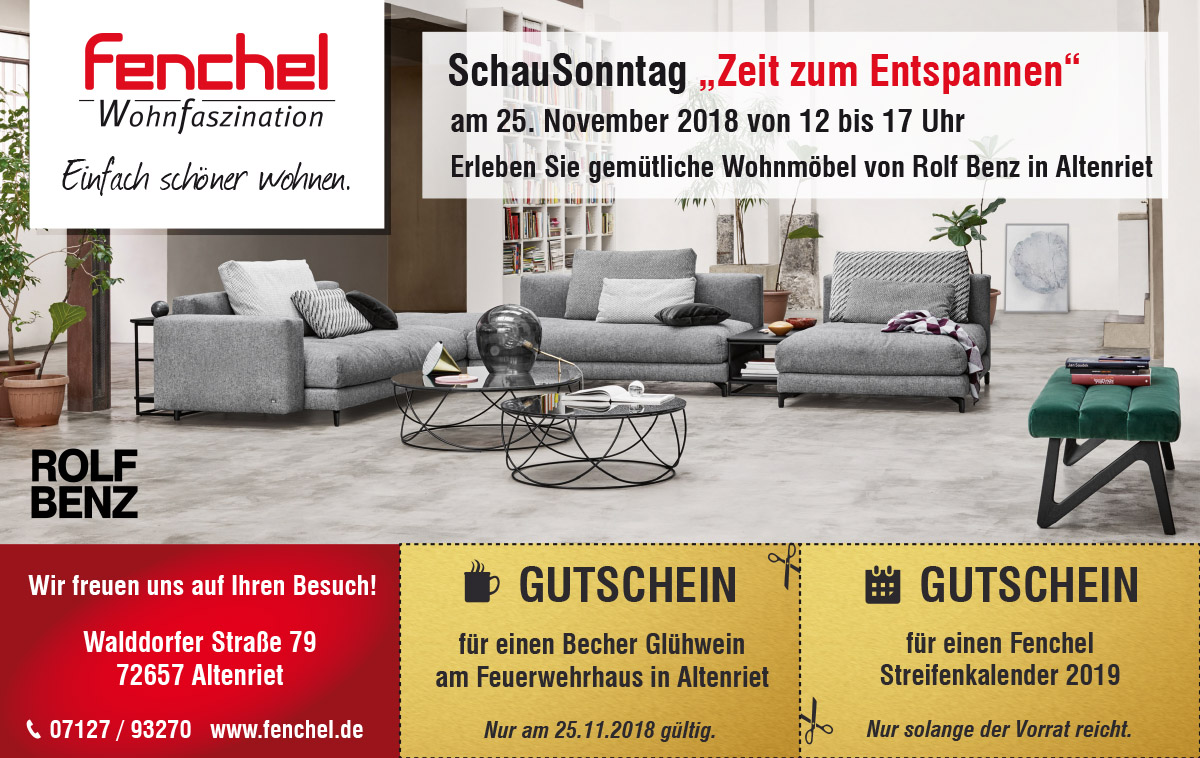 Pünktlich zum Advent zeigen wir Ihnen, wie Sie es sich in Ihrem zu Hause richtig kuschelig machen können. Aus diesem Grund haben wir am Sonntag, den 25. November 2018 von 12 bis 17 Uhr in Altenriet einen SchauSonntag für Sie im Programm!